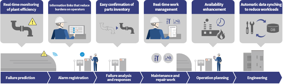Integration of digitized data has the power to visualize and instantly clarify the information power plant operators need, from equipment status to management level. The service can handle data from multiple plants, covering areas including operation data, specifications, equipment ledger and parts inventory. Seamless linking can significantly reduce the time required for multiple series of maintenance operations.